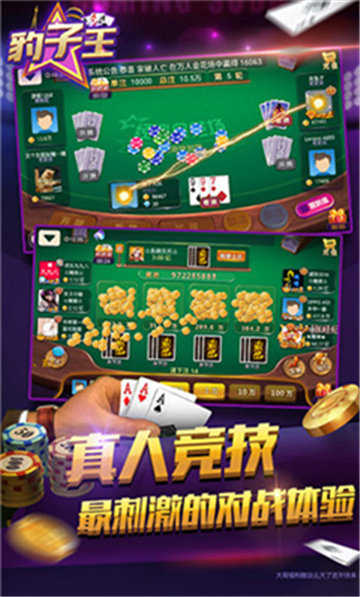 豹子王这是一个非常有意思的手机棋牌平台,在这款游戏里面有着非常强大的语音系统,可以让每一位玩家在这里实现线上语音交流,但是在打牌的过程当中,是不允许进行语音交流的,防止两个人互相串通信息,影响游戏的公平性。